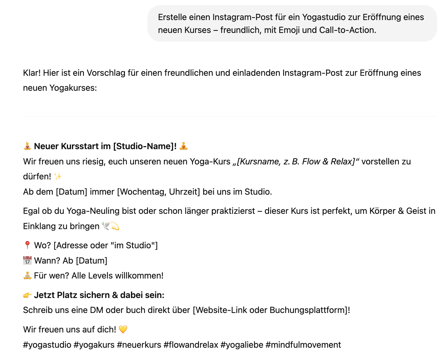 1. Erstellung eines Social-Media Beitrags: „Erstelle einen Instagram-Post für ein Yogastudio zur Eröffnung eines neuen Kurses – freundlich, mit Emoji und Call-to-Action.“