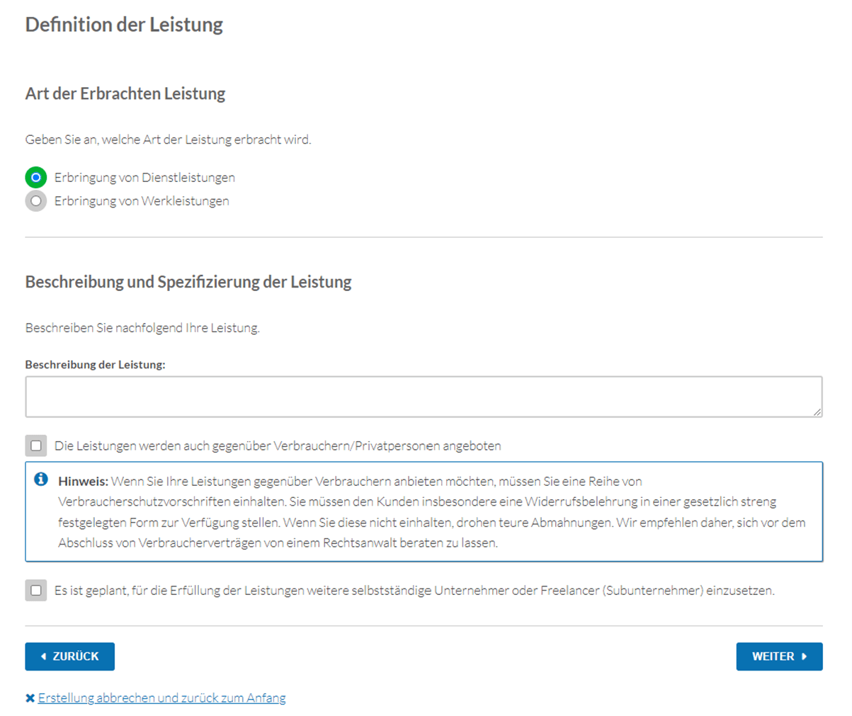 Der Vorteil ist, dass Sie bei einem Generator Schritt für Schritt durch die relevanten Angaben geleitet werden und zusätzliche Informationen bekommen, worauf Sie beim Ausfüllen achten müssen. Dazu kommt, dass sie zeitlich ungebunden sind und viele Generatoren entweder kostenfrei oder kostengünstig sind.