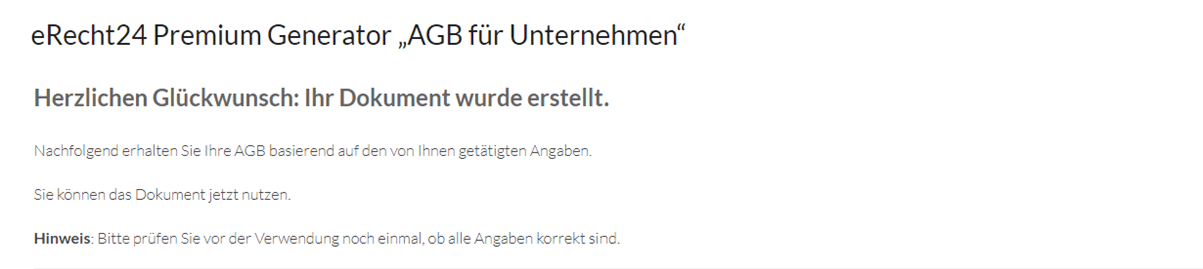 Zur Erstellung werden Sie Schritt für Schritt nach den auf Ihr Unternehmen zutreffenden Informationen gefragt und können im Anschluss auf Knopfdruck Ihre personalisierten Allgemeinen Geschäftsbedingungen als Dokument herunterladen.