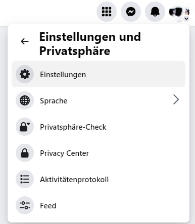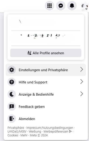 Wollen Sie Ihr Facebook-Konto löschen, müssen Sie oben rechts auf Ihr Profilbild klicken. Dort erscheint ein Drop-Out-Menü. Klicken Sie auf “Einstellungen und Privatsphäre".