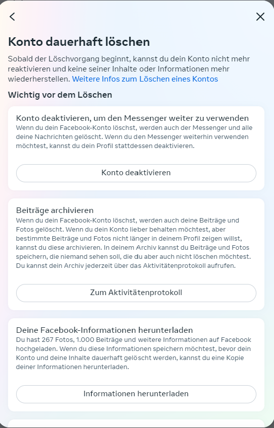 Wählen Sie im nächsten Schritt ebenfalls “löschen” aus, dann gelangen Sie in eine Übersicht, bei der Sie Ihre vorhandenen Daten noch einmal sichern und herunterladen können. Facebook führt auf, welche Daten mit der Facebook-Konto-Löschung entfernt werden.