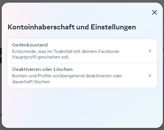In der nächsten Übersicht können Sie auswählen, ob Sie das Konto in den Gedenkzustand setzen wollen oder ob Sie Ihr Konto deaktivieren oder löschen wollen. Klicken Sie im Falle einer Löschung auf “Deaktivieren und löschen”.
