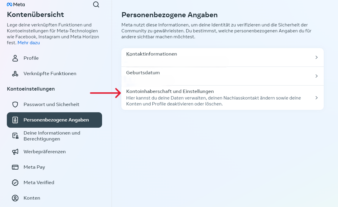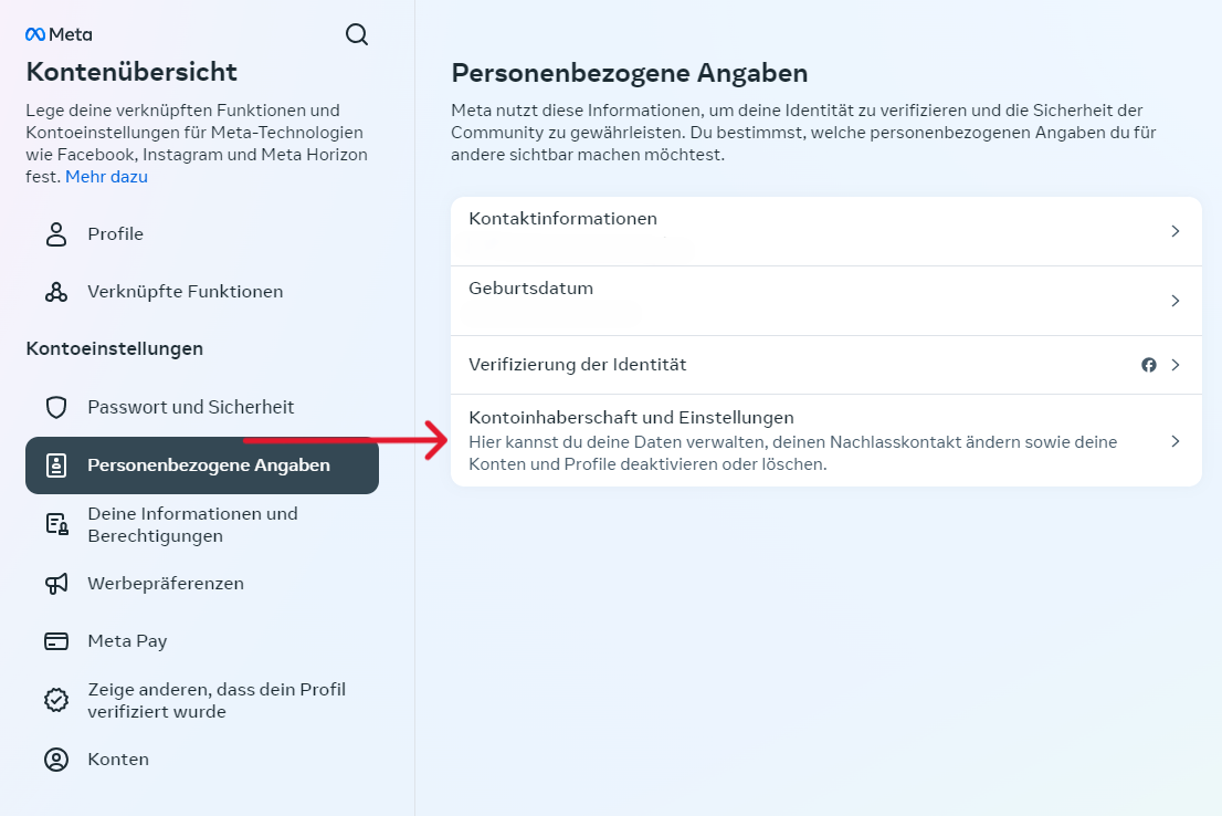 In Ihrer Kontenübersicht klicken Sie links zunächst auf “Personenbezogene Angaben” und anschließend ganz unten auf “Kontoinhaberschaft und Einstellungen”.