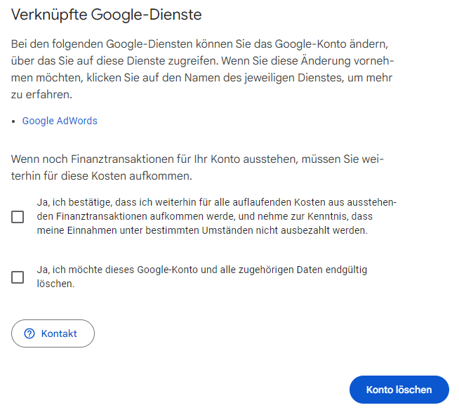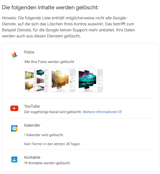 Da über Google oft verschiedene Dienste wie die Foto-Cloud, der Drive, Gmail oder der Kalender genutzt werden, warnt Google vor der Löschung, dass alle diese Dienste dann nicht mehr verfügbar sind.