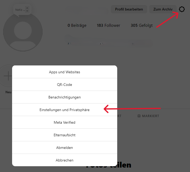 Danach klicken Sie oben rechts auf das Zahnrad und dann auf “Einstellungen und Privatsphäre”.