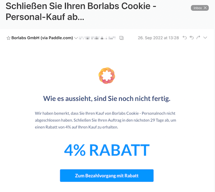 Sie dürfen den eingeloggten Kunden, der zuvor bereits eine Registrierung im Shop abgeschlossen und eine Bestellung getätigt hat, dementsprechend ohne Einwilligung per E-Mail darauf aufmerksam machen, dass er den Checkout-Prozess nicht abgeschlossen hat und noch Artikel in seinem Warenkorb liegen.