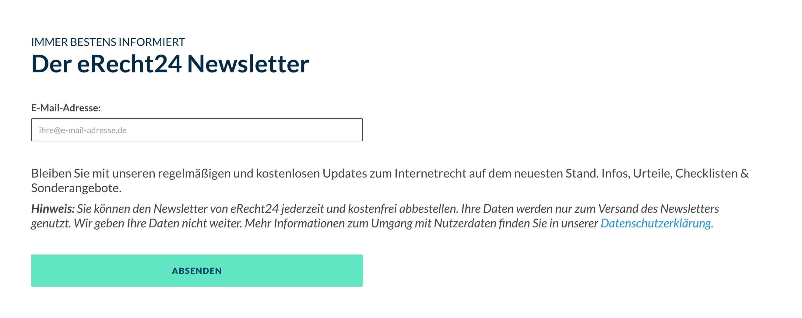 Beachten Sie die rechtlichen Vorgaben, müssen Sie weder Abmahnungen noch Bußgelder befürchten. Mit dem eRecht24 Datenschutz-Generator erstellen Sie eine rechtssichere Datenschutzerklärung für Ihren Online-Shop und können diese direkt neben dem Formular zur Newsletteranmeldung verlinken.
