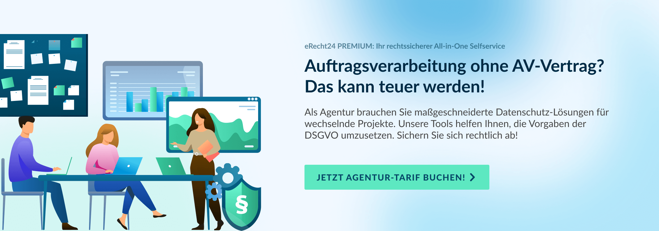 Arbeiten Sie als Agentur mit externen Dienstleistern zusammen, die personenbezogene Daten in Ihrem Auftrag verarbeiten (z. B. Cloud-Dienste, Buchhaltung, IT-Support)? Dann ist ein Auftragsverarbeitungsvertrag (AVV) erforderlich. Dieser regelt, wie der Dienstleister mit den Daten umgeht und welche Sicherheitsmaßnahmen er einhalten muss.