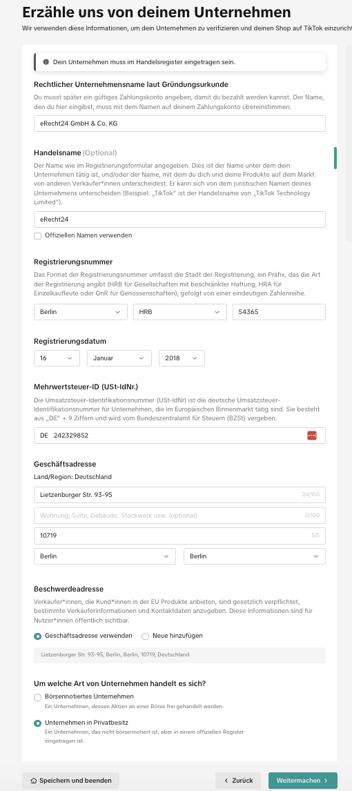 Im ersten Schritt gehen Sie auf die offizielle Seite des TikTok Shop Seller Centers und registrieren sich mit Ihren Unternehmensdaten: