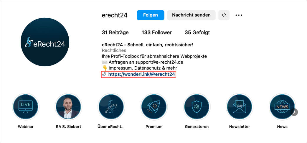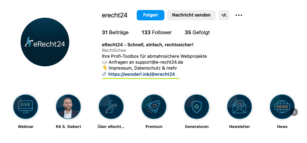 So möchten gerade Unternehmen auf Social-Media-Kanälen wie Instagram natürlich nicht nur direkt auf das Impressum verlinken, sondern vielleicht auch auf Ihre Webseite oder Ihren Online-Shop. Hierfür gibt es entsprechende Drittanbieter-Tools, mit welchen Sie eine Art Inhaltsverzeichnis / Landingpage erstellen können, welche über einen Link in Ihrem Profil erreichbar ist.