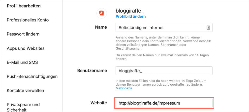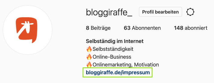 Sie fügen in Ihren Profileinstellungen des Social-Media-Kanals unter dem Punkt "Website" direkt einen Link zu Ihrem Impressum Ihrer Webseite oder einer extra dafür erstellten Seite ein.