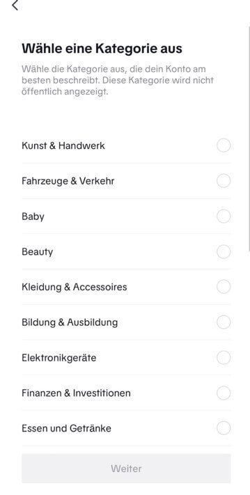 7. Wählen Sie Ihre Kategorie aus, der Ihr Unternehmen sowie Ihren TikTok-Account am besten beschreibt.