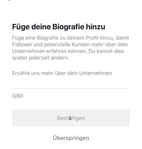 9. Danach können Sie eine „Biografie“ Ihres Unternehmens hinzuzufügen. Tragen Sie dort am besten Ihren Geschäftsbereich oder Ihre Tätigkeit ein.
