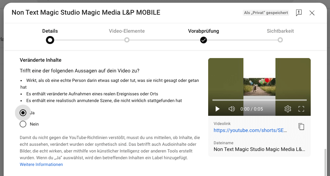 YouTube: Wenn Sie Videos hochladen, müssen Sie angeben, ob es sich bei Inhalten im Video (Ton, Video, Bilder) um “veränderte Inhalte” handelt. Wenn Sie also Inhalte, die echt wirken, stark verändert oder synthetisch generiert haben, müssen Sie dies bei YouTube Studio angeben. Mehr dazu können Sie bei YouTube lesen: KI-generierte Inhalte bei YouTube.