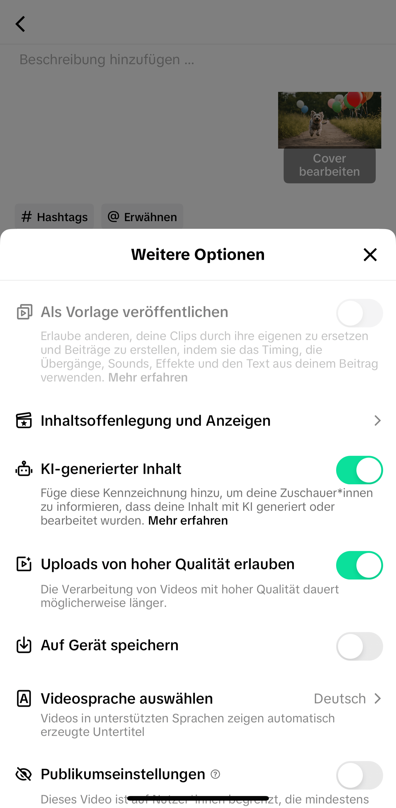 So sieht es aus, wenn Sie ein Video bei TikTok als KI-generiert kennzeichnen:
