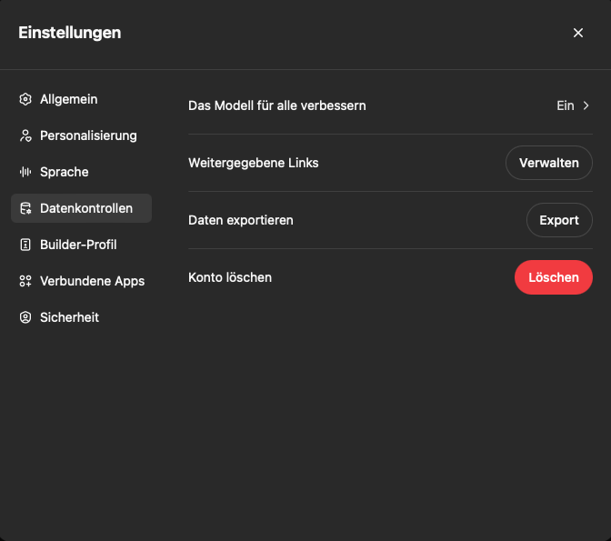 Gehen Sie auf den Punkt “Das Modell für alle verbessern”. Es öffnet sich eine bereits aktivierte Schaltfläche mit der Erklärung “Erlaube uns, unsere Modelle mit deinen Inhalten zu trainieren, um ChatGPT für dich und alle, die es verwenden, noch besser zu machen (...).” Deaktivieren Sie die Schaltfläche. Ihre eingegebenen Daten und Chats werden nun nicht mehr zur Modellverbesserung genutzt.