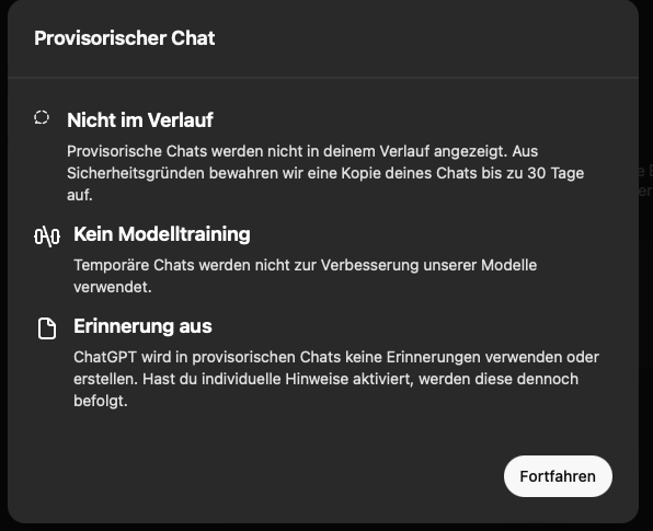 Alternativ können Sie im provisorischen Chat mit ChatGPT schreiben. Dieser Chat erscheint nicht in Ihrem Verlauf und wird auch nicht zum Training des KI-Modells verwendet.