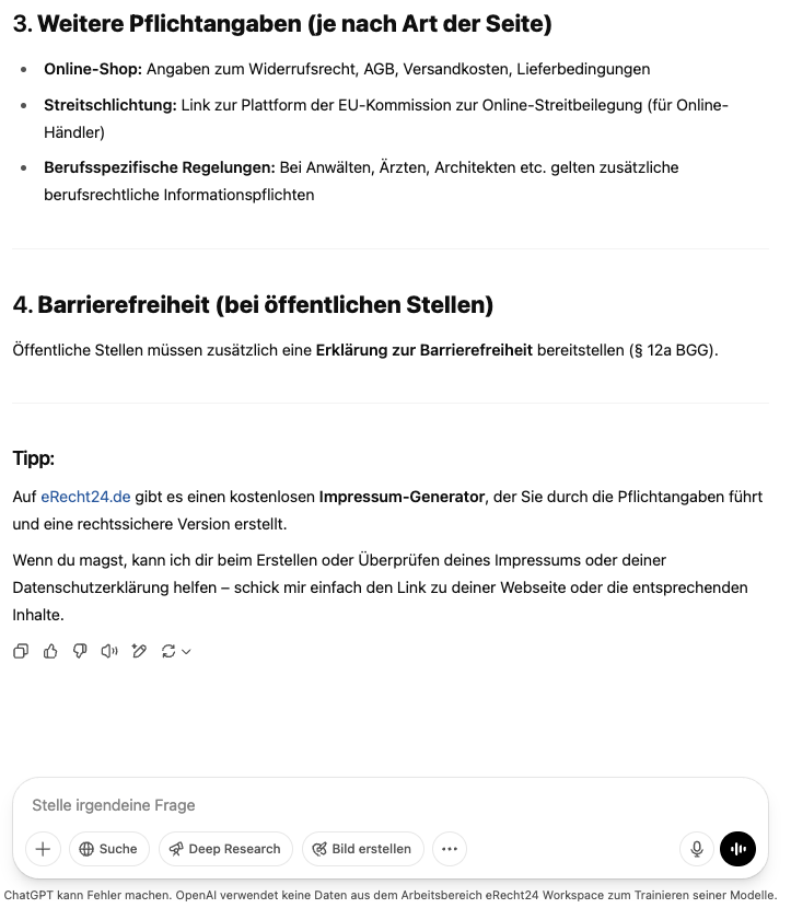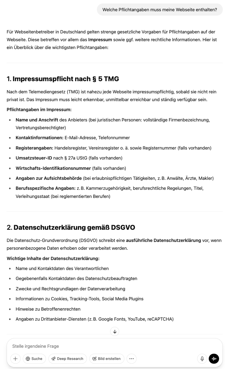 ChatGPT listet eine Menge an Anforderungen, die größtenteils korrekt sind. Das Problem ist, dass nicht alle Pflichtangaben einer Webseite aufgelistet werden und teils falsche und sogar erfundene Anforderungen (sog. Halluzination) aufgelistet werden.