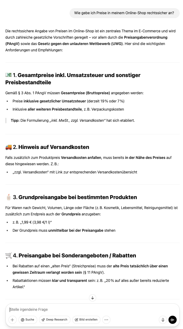 - Auch informiert ChatGPT nicht darüber, wie Sie Streichpreise angeben müssen. Hier gibt es seit 2022 klare Regeln und Sie müssen den niedrigsten Gesamtpreis der letzten 30 Tage als durchgestrichenen Preis angeben.