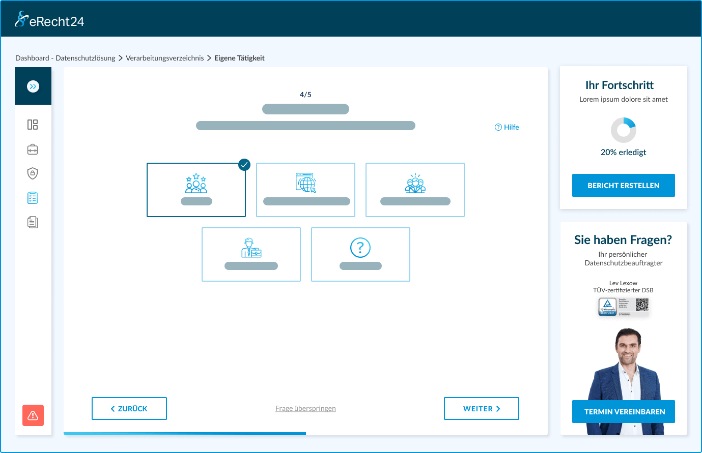 Beantworten Sie Fragen aus verschiedenen Kategorien und erhalten Sie anschließend Ihr Verzeichnis der Verarbeitungstätigkeiten sowie eine Liste der technischen und organisatorischen Maßnahmen.