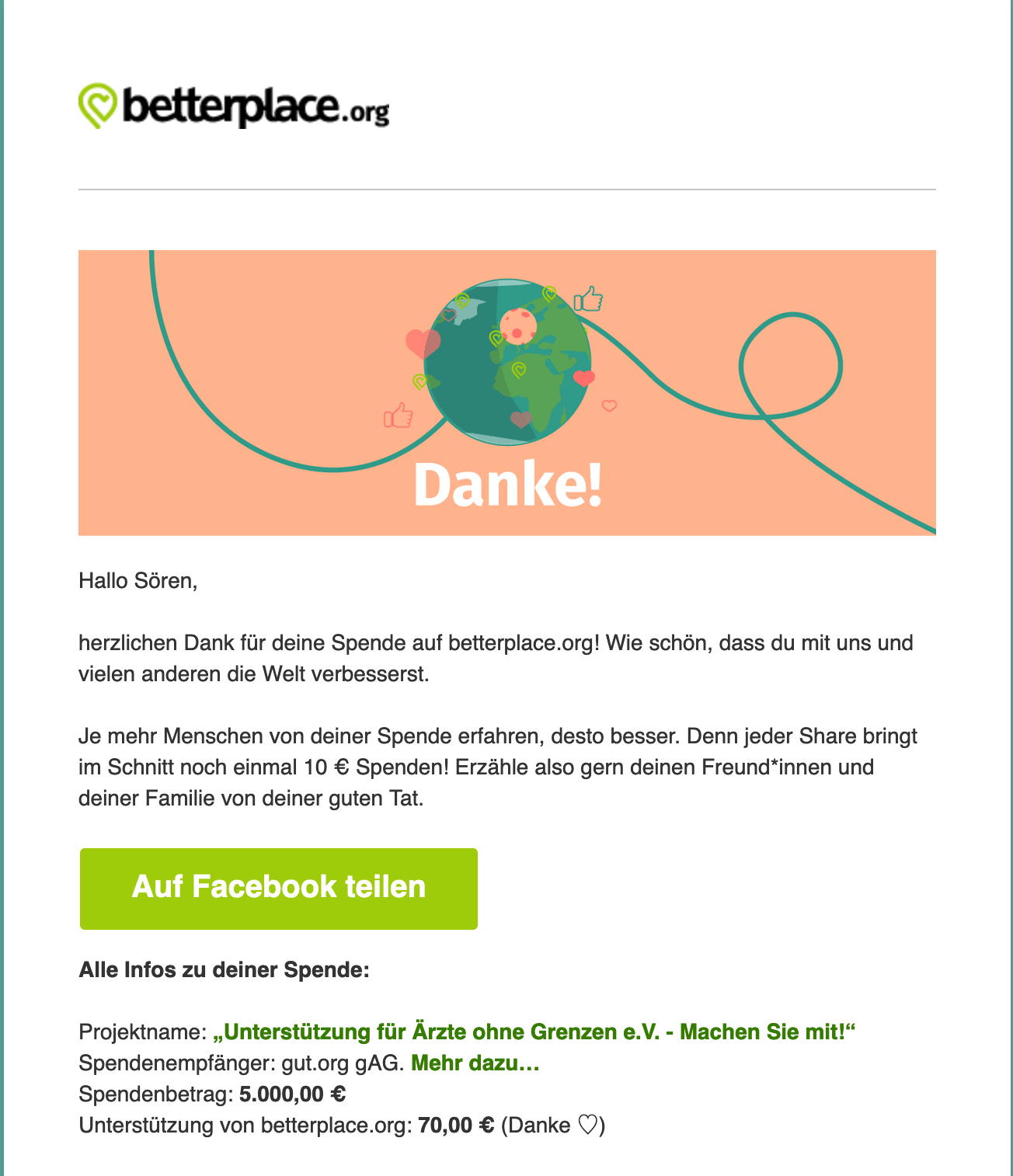 Seit 2016 spenden wir jedes Jahr im Dezember an gemeinnützige Vereine und Projekte. Nachdem wir im Jahr 2016 insgesamt 4.000 Euro spenden konnten waren es 2017 schon 5.000 Euro für einen guten Zweck. Dieses Ergebnis haben wir im Jahr 2018 deutlich gesteigert und konnten schon 8.000 Euro für einen guten Zweck spenden. 2019 haben wir dann sogar die große Summe von 10.000 Euro geknackt und zu gleichen Teilen an "Die Arche Feriencamps" und "Ärzte ohne Grenzen" gespendet.