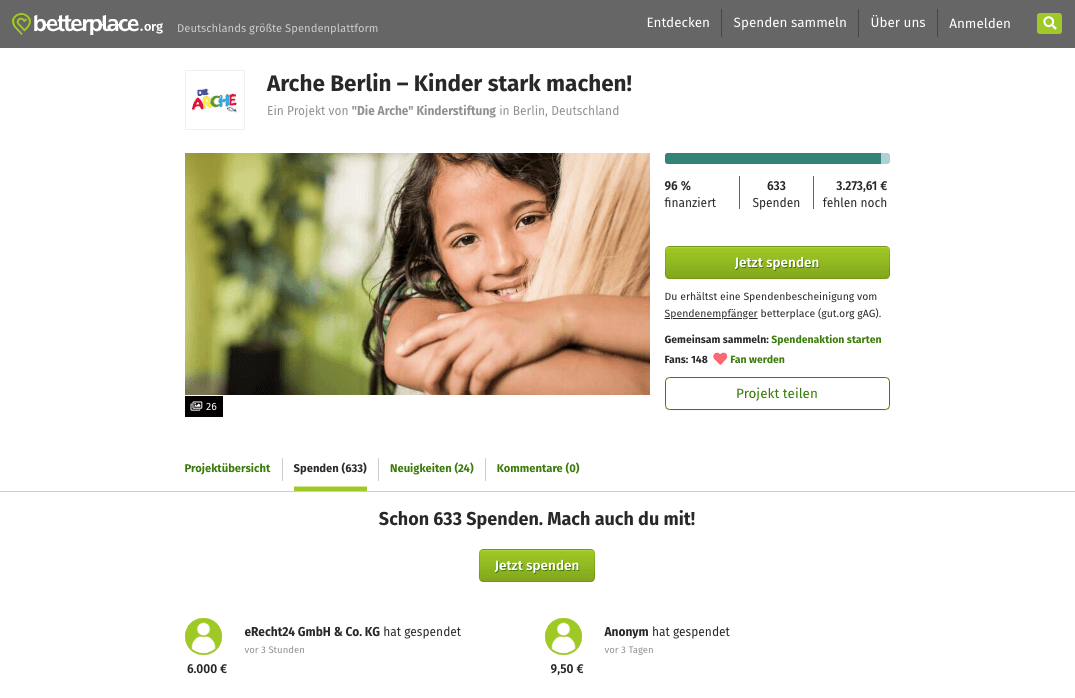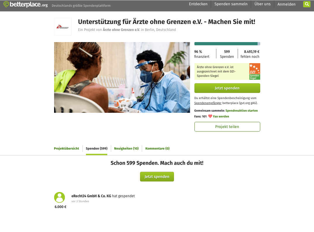 2021 haben wir insgesamt 18.000 Euro aus unserer eRecht24 Weihnachtsaktion gespendet. Die Aktion brachte diesmal 6.000 Euro für die "Die Arche", 6.000 Euro für die Nothilfe von "Ärzte ohne Grenzen" sowie 6.000 Euro für das Projekt "Ambulanz & Pflegezimmer für obdachlose Menschen" zusammen.