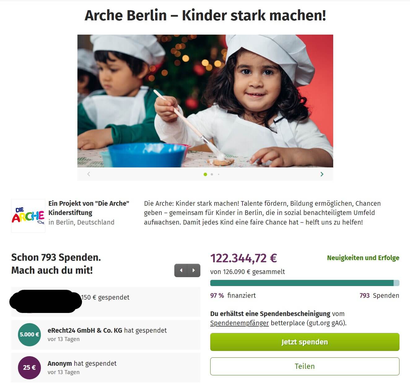 2022 haben wir insgesamt 20.000 Euro aus unserer eRecht24 Weihnachtsaktion gespendet. Die Aktion brachte diesmal 5.000 Euro für die "Die Arche", 5.000 Euro für die Nothilfe von "Ärzte ohne Grenzen", 5.000 Euro für "HÁWAR.help - Wir für Iran" sowie 5.000 Euro für das Projekt "Ambulanz & Pflegezimmer für obdachlose Menschen" zusammen.