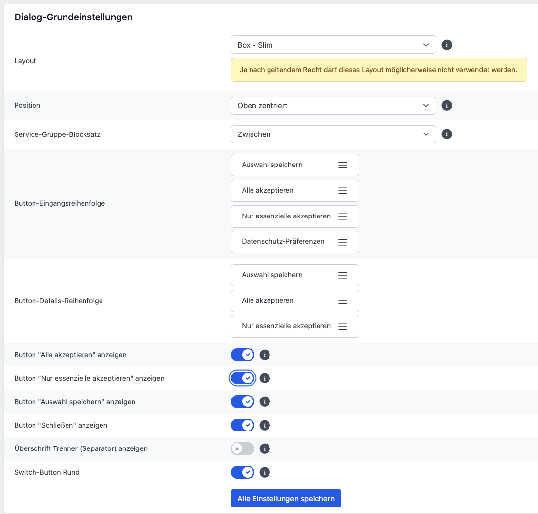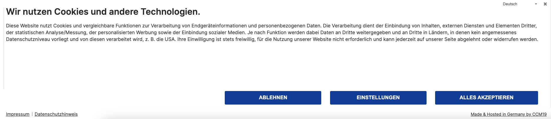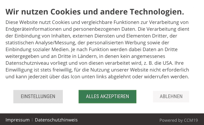 Im Cookie Consent Tool ccm19 werden die beiden Buttons ("Alles akzeptieren" und "Ablehnen") sowie der Button "Einstellungen" standardmäßig vorgegeben. Sie haben beim Cookie Consent Manager in den Einstellungen nur die Möglichkeit, den Button "Ablehnen" auszublenden. Der Button "Einstellungen" lässt sich nicht ausblenden.