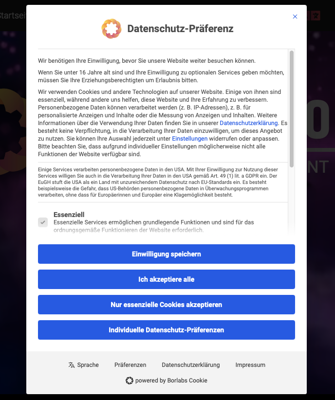 Mit einem Klick auf den Button öffnet sich dann die Cookie-Auswahl von Borlabs Cookie mit den bisherigen Einwilligungen, welche ganz einfach über die Schieberegler widerrufen bzw. geändert werden können.