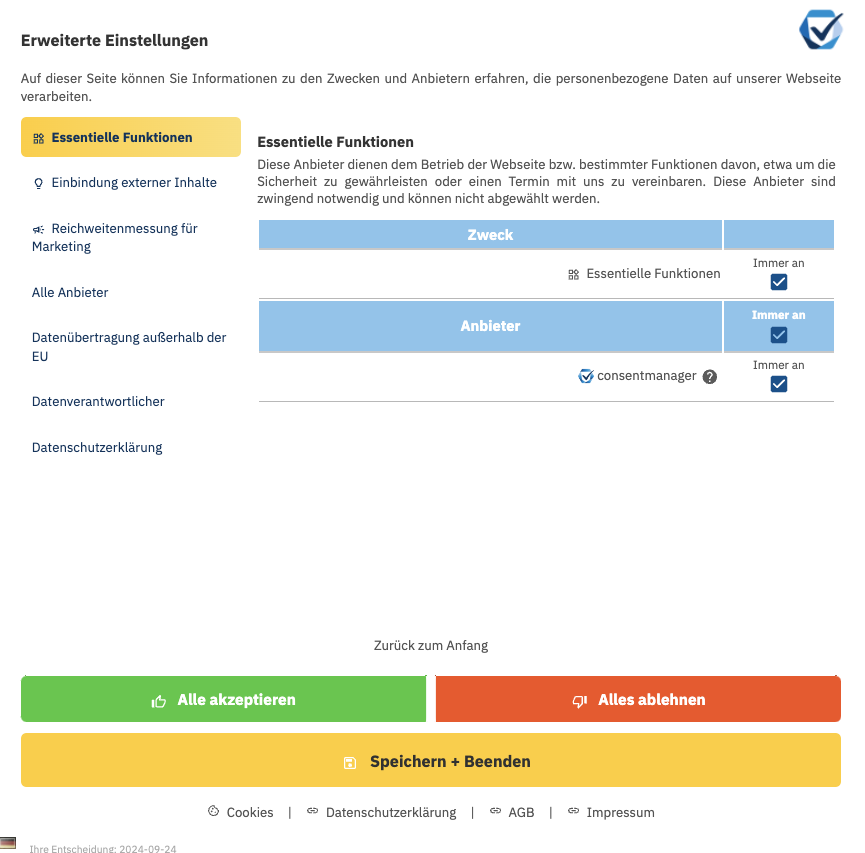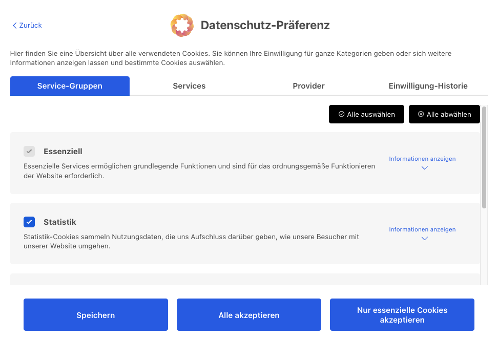Messung der Abzeptanz-Rate und Bounce-Rate, Exportfunktion | Consent Statistiken in den jeweiligen Cookie Gruppen, Einwilligungs-Historie | Speicherung der Auswahl für 12 Monate, danach erneute Einwilligung erforderlich; Scanbericht über Wahl der Websitebesucher |