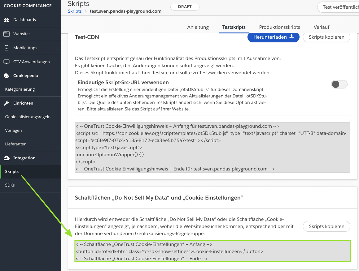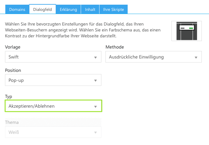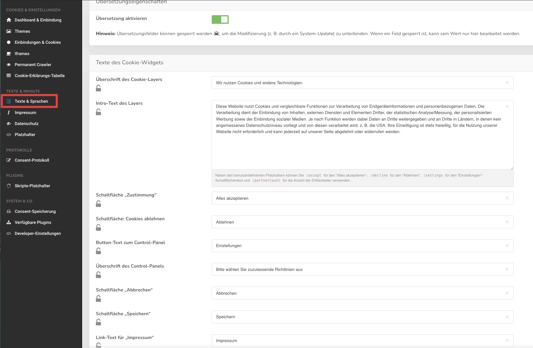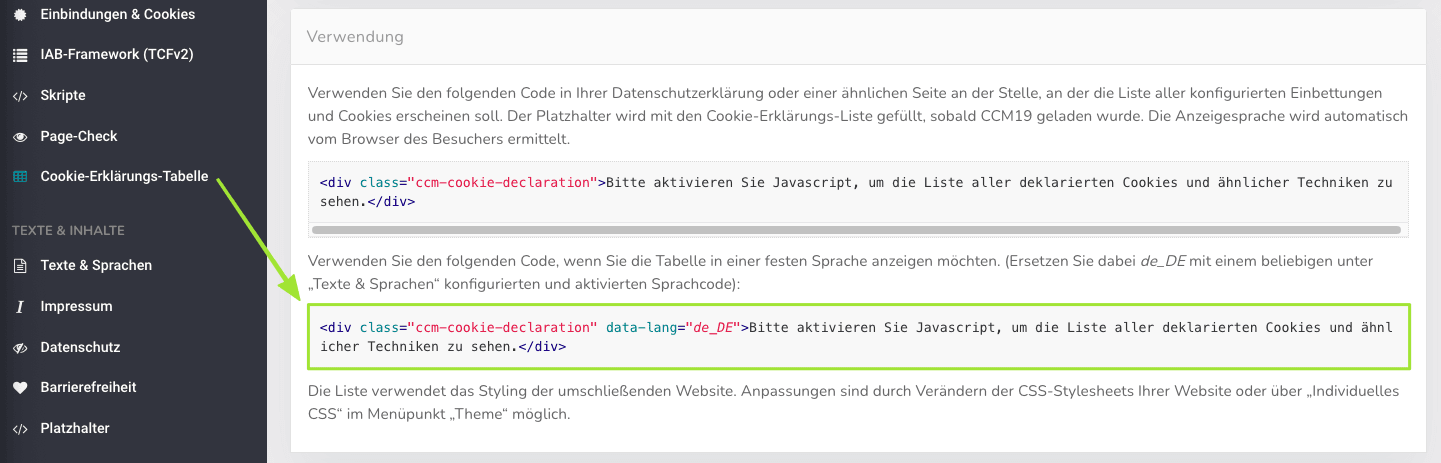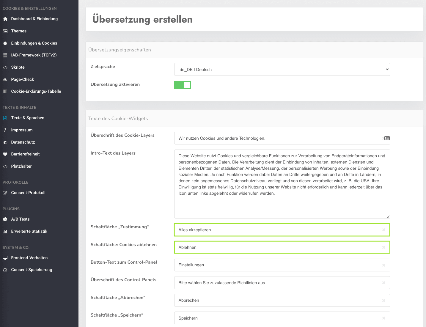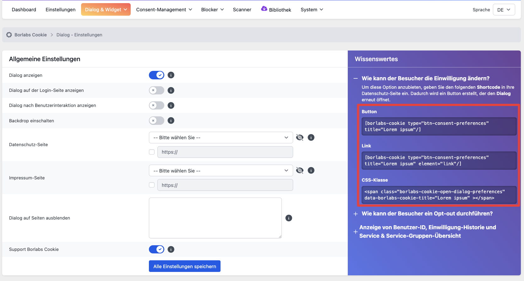 Alle notwendigen Shortcodes für das Widerrufen von Cookies finden Sie direkt im Backend unter Dialog & Widget.