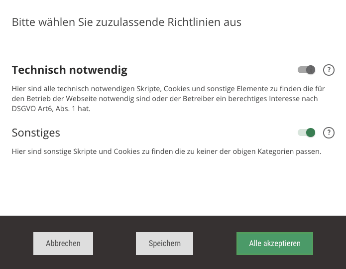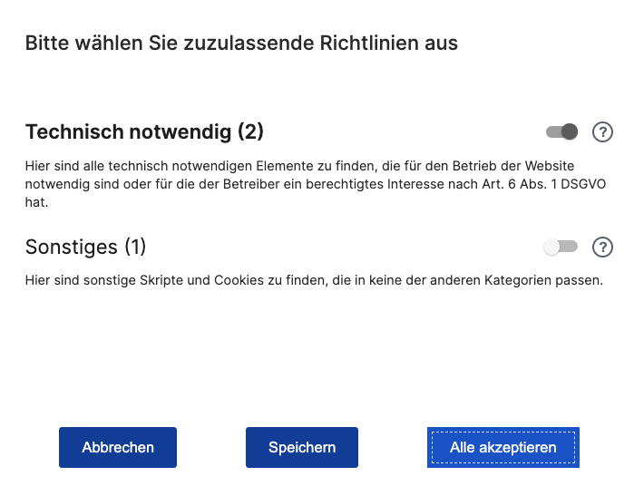 Empfehlung: Blenden Sie den "Ablehnen"-Button auf keinen Fall aus. Um zwei gleichwertige Buttons zu haben, sollten Sie auf ausreichende Kontraste sowie eine passende Farbwahl bei den Buttons "Alles akzeptieren“ und "Ablehnen" achten.
