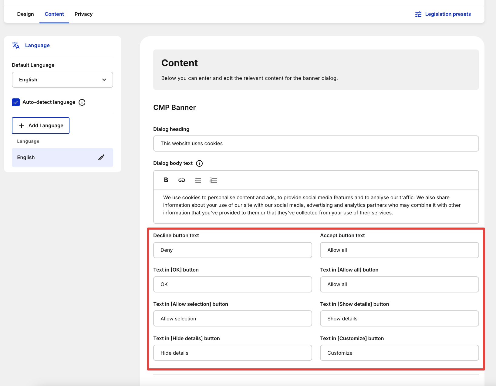 Lediglich die Beschriftung innerhalb der Buttons können Sie über die Content-Einstellungen anpassen.