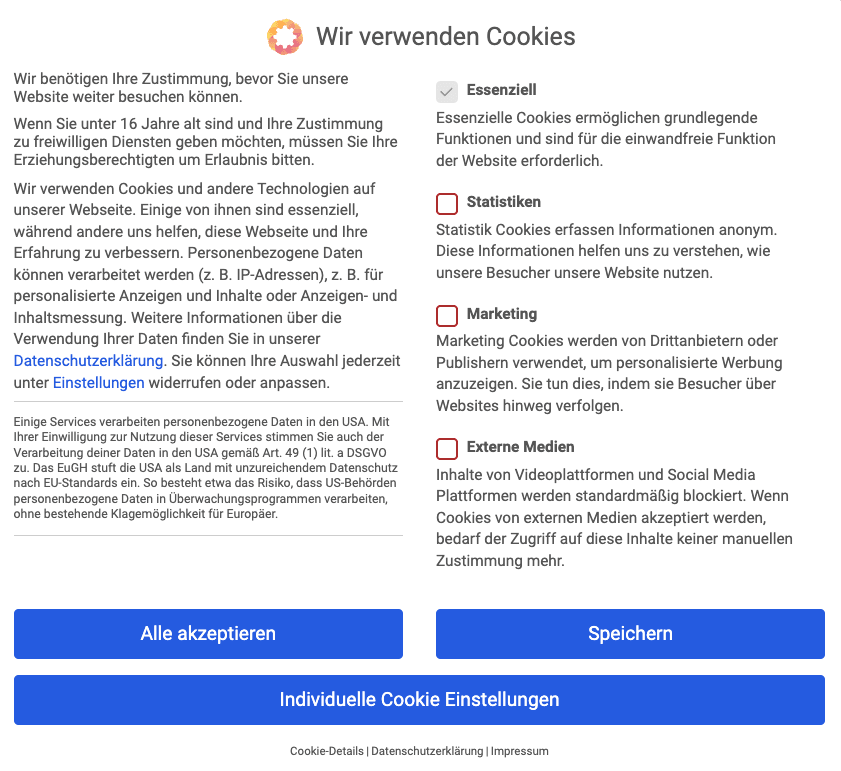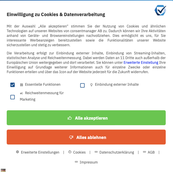 Eine aktive Einwilligung, auch Opt-In genannt, ist erforderlich, sobald Sie nicht-erforderliche Cookies wie Werbe Cookies, Tracking Cookies oder Analyse-Tools wie Google Analytics verwenden möchten.