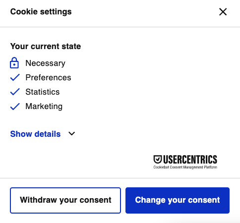 Um die Einwilligung zu widerrufen, bietet Cookiebot ein Widget an, welches unten links am Bildschirmrand eingeblendet wird.