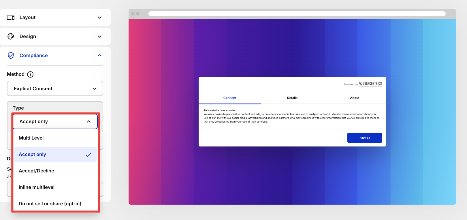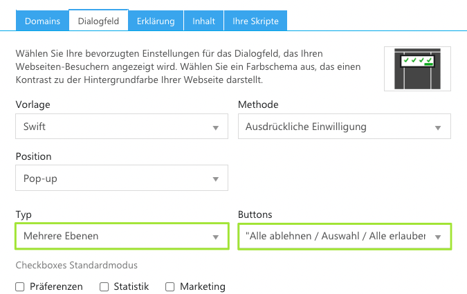 Sie können in den Einstellungen unter "Dialogfeld" den Typ "Mehrere Ebenen" auswählen sowie die Buttons "Alle ablehnen, Auswahl, Alle erlauben" wählen.