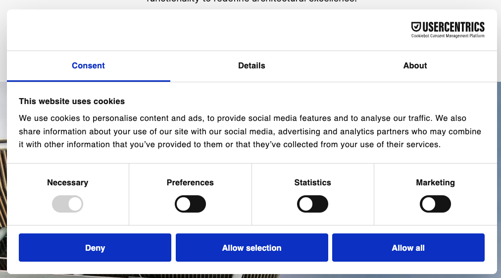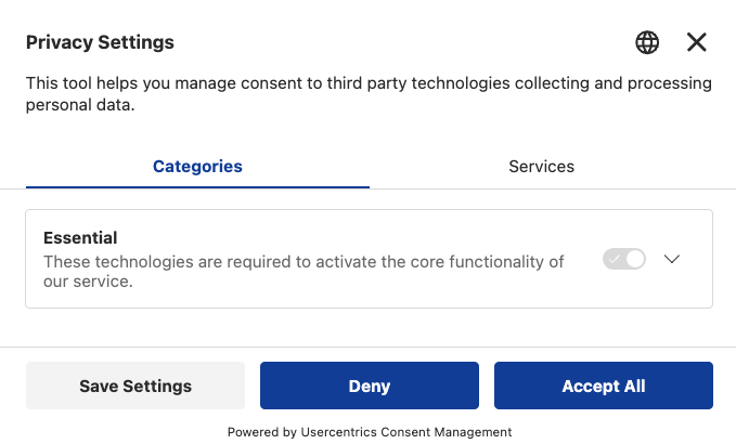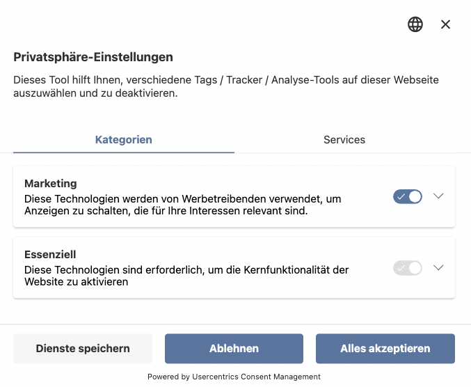 Usercentrics bietet standardmäßig zwei Buttons („Ablehnen“ und „Alles akzeptieren“) an. Diese können Sie auch in den Einstellungen nicht verändern. Sobald Sie Usercentrics via Script in Ihre Website eingebunden haben, wird die Consent-Box - wie oben zu sehen - ausgegeben.