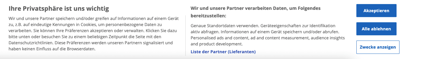 Auch beim Consent Management Provider Tool sind standardmäßig zwei Buttons integriert („Alles ablehnen“, „Alles akzeptieren“).