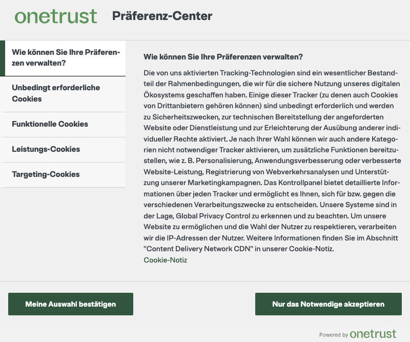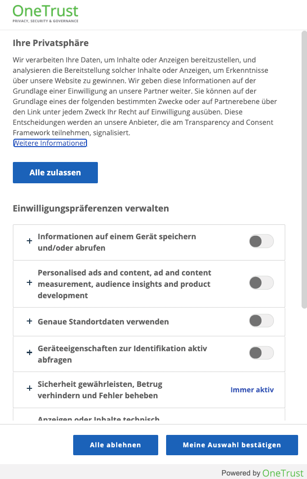 Auch beim Consent Management Tool OneTrust ist die Anzeige der wichtigsten zwei Buttons („Akzeptieren“ und „Alles ablehnen“) Standard. Das bedeutet: Sie haben keine Möglichkeit, diese Buttons zu ändern, da sie fest vorgegeben werden.