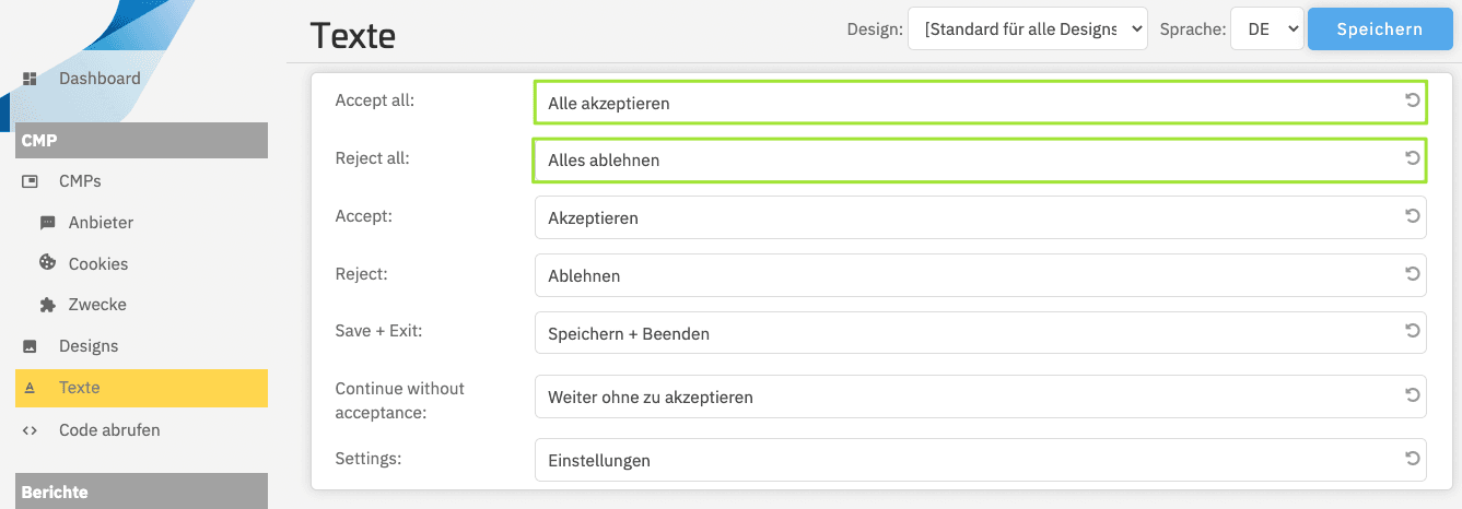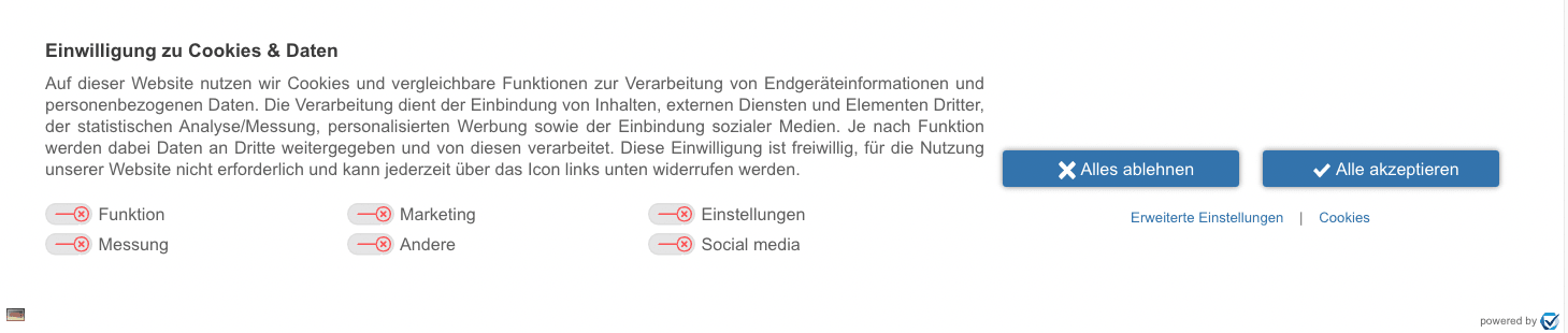 - zwei gleichwertige Buttons, z.B. „Alles akzeptieren“ und „Ablehnen“