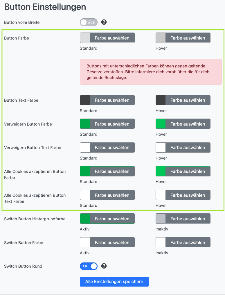 Das Cookiebot Consent-Tool bieten Ihnen verschiedene Einstellungen zur Anzeige der Buttons innerhalb der Cookie-Box.