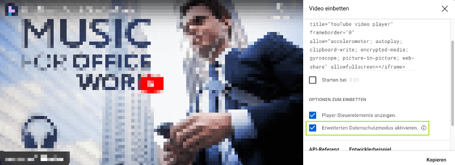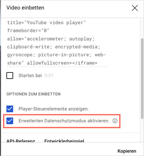 Das funktioniert über das YouTube-Cookie „No-Cookie“. Aktivieren Sie dazu den „Erweiterten Datenschutzmodus“, indem Sie auf Video teilen → Einbetten → Optionen zum Einbetten gehen und ein Häkchen im entsprechenden Kästchen setzen:
